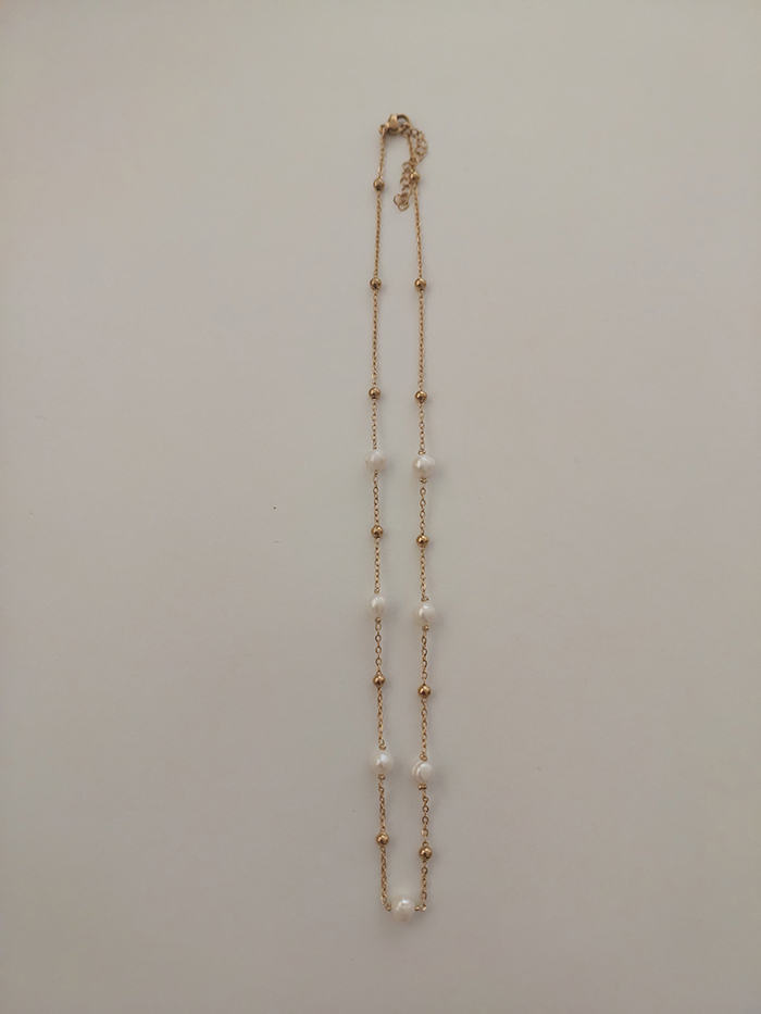 Gerçek kültür incilerinin saf beyazlığı, altın renginin sıcaklığı ve dorika toplarının ışıltısıyla bu modern tasarımda buluştu. 40 cm uzunluğundaki bu zarif kolye, boynunuza tam oturarak (choker tarzı) yüzünüze aydınlık bir ifade katar. Tek başına kullanıldığında sofistike, diğer altın renkli zincirlerinizle birleştiğinde ise trend bir görünüm sunar.